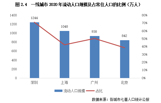 具體到各城市來看。在流動人口規模方面,一線城市規模優勢遙遙領先,四個城市的流動人口規模均在800萬以上,其中深圳和上海更是超過了1000萬,位居典型城市TOP1、2位。在比例方面,“移民城市”深圳以71%的占比位居四個城市首位,是一線城市中唯一流動人口規模顯著高于本地戶籍人口的城市。