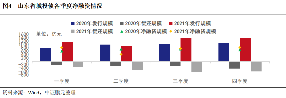 2021年山東城投發(fā)債規(guī)模和凈融資額均較2020年有所增加但增速放緩,同時(shí)季度波動(dòng)明顯