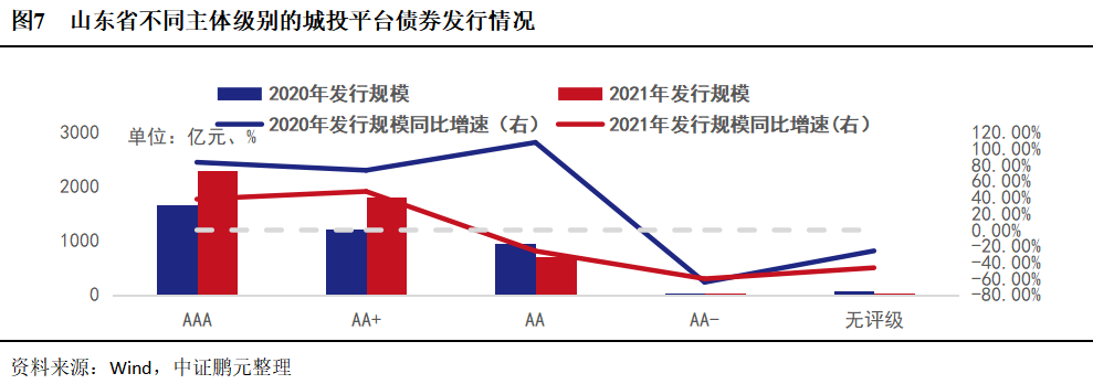 (2)高行政層級(jí)、高評(píng)級(jí)主體發(fā)行規(guī)模占比增加,弱資質(zhì)平臺(tái)增速下降明顯。2021年山東省高行政層級(jí)主體城投債發(fā)行規(guī)模占比增加且同比增速相對(duì)更高、增速放緩程度也更小,區(qū)縣主體發(fā)行增速大幅下滑。高級(jí)別主體城投債發(fā)行規(guī)模占比提升,同比增速表現(xiàn)更為穩(wěn)健,同時(shí)也是拉動(dòng)凈融資增長(zhǎng)的主要?jiǎng)恿Α?/p>