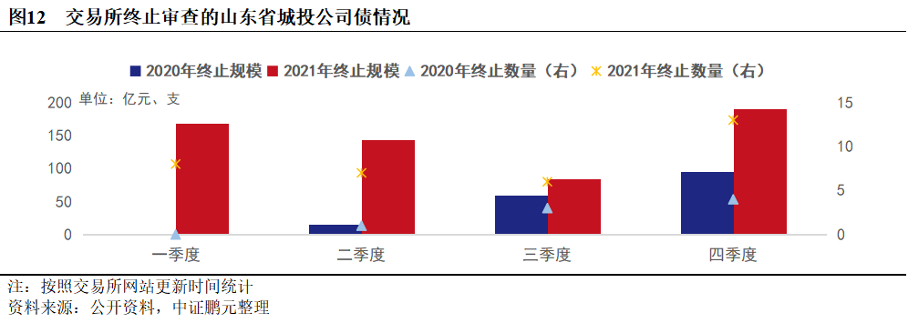 (5)交易所終止審查項(xiàng)目大幅增加,地區(qū)整體債務(wù)水平偏高區(qū)域推遲或取消發(fā)行債券更多。2021年山東省在交易所終止的公司債項(xiàng)目大幅增加,私募債受影響更大,青島和濰坊數(shù)量居前。推遲或取消發(fā)行的城投債數(shù)量和規(guī)模較上年均有下降,地區(qū)整體債務(wù)水平偏高區(qū)域多發(fā)。