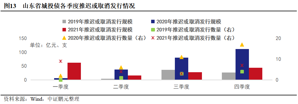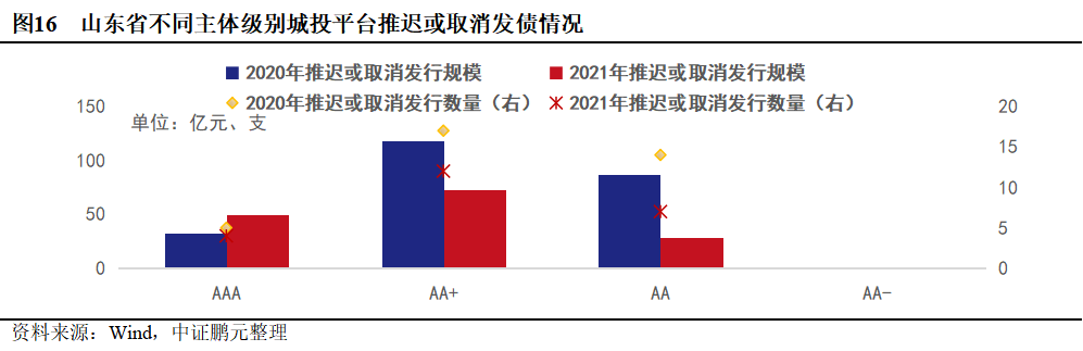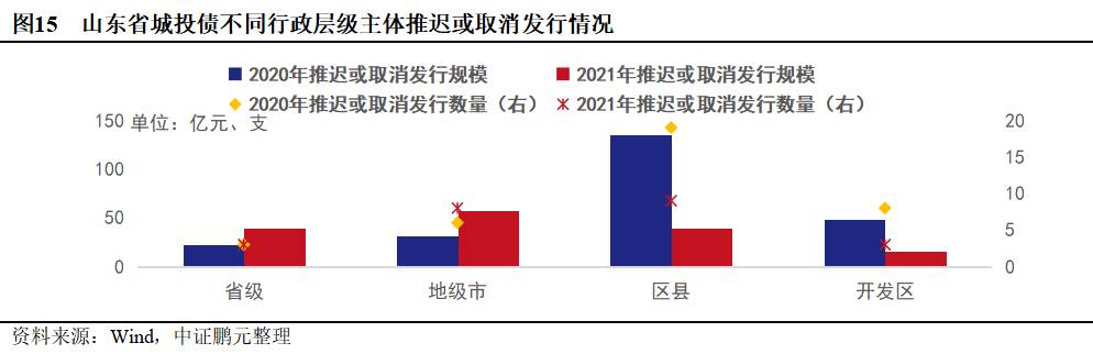 從不同行政層級(jí)主體來(lái)看,2021年山東省地級(jí)市和省級(jí)主體推遲或取消發(fā)行的城投債規(guī)模更大,但從數(shù)量上看區(qū)縣和地級(jí)市城投更多。