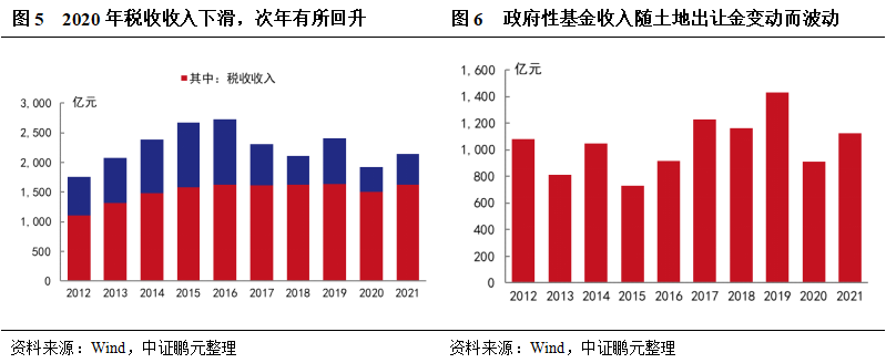 天津市財政自給程度較高,疫情沖擊下2020年財政收入下滑,2021年表現轉好。受疫情沖擊、國際大宗商品價格波動及各項減稅降費政策影響,2020年天津市交通運輸、房地產、石油石化等重點行業稅收收入降幅達到20%至30%,當年一般公共預算收入按可比口徑下降10.2%,次年收入規模回升至正常水平。2021年天津市實現一般公共預算收入2,141億元,其中稅收收入占比75.75%,財政自給率為67.96%。近年天津市政府性基金收入隨著土地出讓收入規模變動大幅波動,2021年為1,126.5億元,同比增長23.5%。