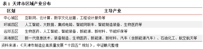 天津市著力構建現代工業體系,濱海新區為戰略性新興產業發展主陣地。近年天津市著力構建“1+3+4”現代工業產業體系,1即智能科技產業;3為生物醫藥、新能源、新材料三大新興產業;4是航空航天、高端裝備、汽車、石油石化四大優勢產業。根據《天津市制造業高質量發展“十四五”規劃》,到2025年天津市工業戰略性新興產業增加值占規模以上工業增加值比重達到40%,其中濱海新區工業戰略性新興產業增加值占全市比重保持在60%以上。天津全市和下屬區劃產業規劃明確,但產業發展尚在轉型階段,區域經濟增長在調結構、穩增長中尋求平衡。