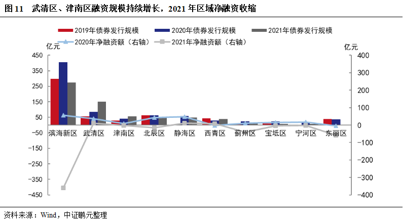 財政自給程度較高,但區域債務負擔重,再融資券發行緩解地方債務壓力。2021年天津市稅收收入占比75.75%,財政自給率為67.96%,濱海新區、和平區、河西區等主要城區財政收入質量較好。天津市廣義債務率全國居首,2021年天津市政府發行超千億再融資債券緩解地方債務壓力。