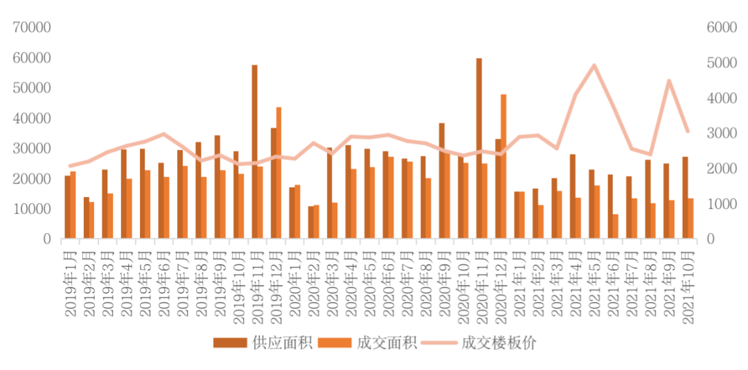 成交方面,雖然本月集中土拍的重點城市個數較上月減半,但在三四線城市成交量大幅回升的帶動下,10月成交面積仍較上月進一步走高。據CRIC統計數據顯示,全國土地市場經營性用地成交建筑面積環比微漲5%至13310萬平方米。