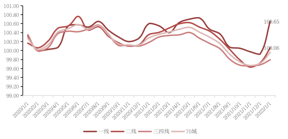 這主要是由于受2021年下半年市場下行影響,至2022年1月三四線城市二手住宅價格仍有0.7%的同比降幅。二手房市場不振下三四線城市購房者不具備充足的購房資金和心理預期投入新房市場。