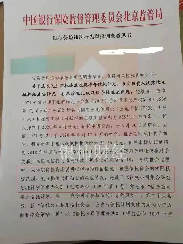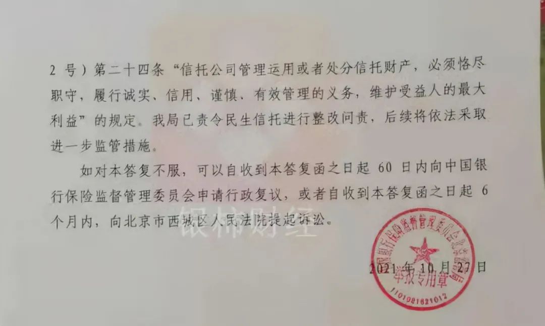 9月份,筆者曾報道過民生信托旗下置信316號出現(xiàn)風險的情況,來自北京銀保監(jiān)局出具的《舉報調查意見書》中顯示,該產品未向投資人進行信息披露,信托資金運用與信托合同定不符等等。并且責令民生信托進行整改問責,后續(xù)將依法進一步采取行動。