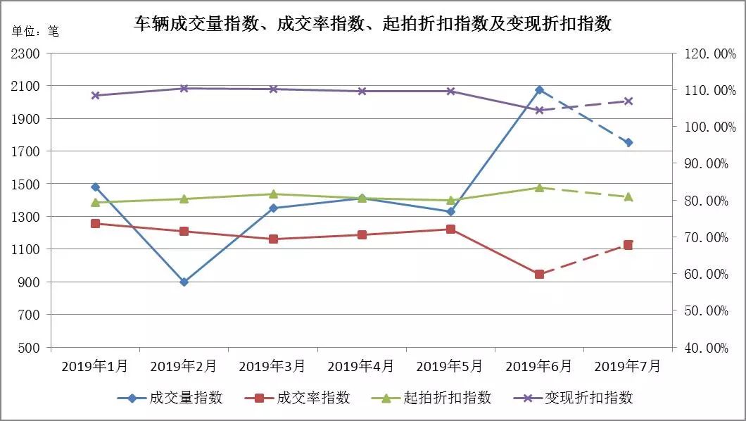 七月預測:成交量在2562至3002筆左右,成交率指數區間[17.83%,19.54%],月起拍折扣指數區間[74.58%,75.31%],變現折扣指數區間[77.89%,80.63%]。