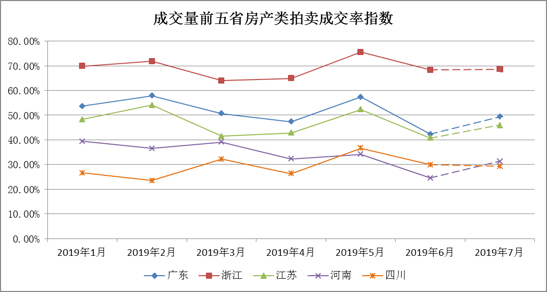 2019年1月至今,前五省的成交率趨勢較為一致,本月五省的成交率都有所下降,特別是廣東省,下降了近15個百分點。從今年整體趨勢來看,成交率從大到小排列依次為浙江、廣東、江蘇、河南、四川,江浙地區、珠三角地區經濟發展水平較高,拍賣市場交易更為開放,拍賣成交的可能性也更大。