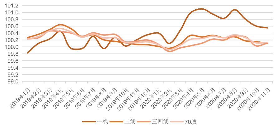 近期,國(guó)家統(tǒng)計(jì)局發(fā)布了2020年11月份70個(gè)大中城市商品住宅銷(xiāo)售價(jià)格變動(dòng)情況。2020年11月,在各地認(rèn)真貫徹落實(shí)黨中央、國(guó)務(wù)院部署,緊緊圍繞穩(wěn)地價(jià)、穩(wěn)房?jī)r(jià)、穩(wěn)預(yù)期的調(diào)控目標(biāo)下,70個(gè)大中城市房地產(chǎn)市場(chǎng)價(jià)格漲幅總體平穩(wěn),略有回落。