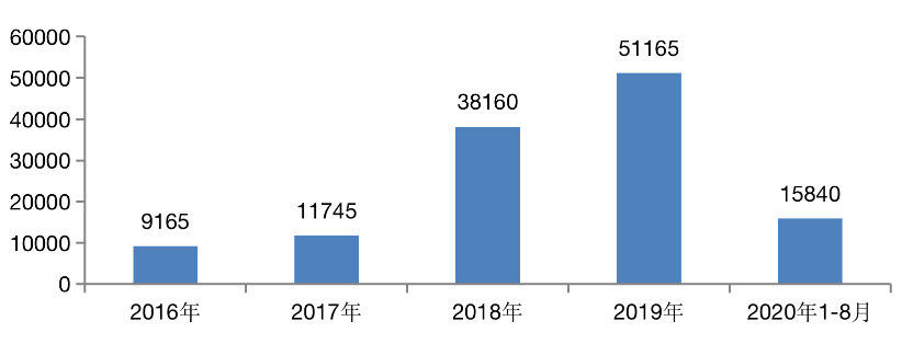 圖:2016-2020年山東省增減掛鉤節(jié)余指標(biāo)流入量(畝)