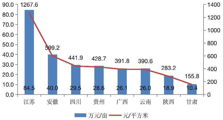 注:為便于對照本章其他章節(jié),上圖同時列出“萬元/畝”和“元/平方米”的單位