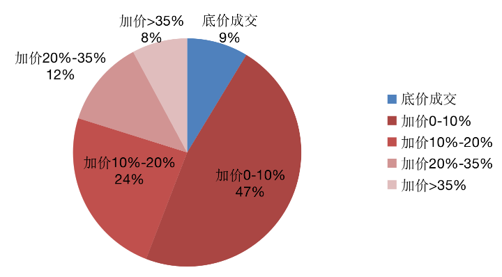 東部區(qū)域中,經(jīng)濟更為發(fā)達(dá)的東南沿海省份用地指標(biāo)爭奪更為激烈。以江蘇省為例,截止2020年6月,江蘇各城市競得的增減掛鉤節(jié)余指標(biāo)高達(dá)44471畝,僅3857畝是底價成交,占比僅有8.7%,其余指標(biāo)均是加價成交,近半數(shù)用地指標(biāo)加價幅度小于10%,另有36%的指標(biāo)加價幅度在10%-35%之間,加價幅度在35%以上的指標(biāo)占比也占到8%,這一系列數(shù)據(jù)顯示出江蘇省內(nèi)各城市用地指標(biāo)的激烈程度。