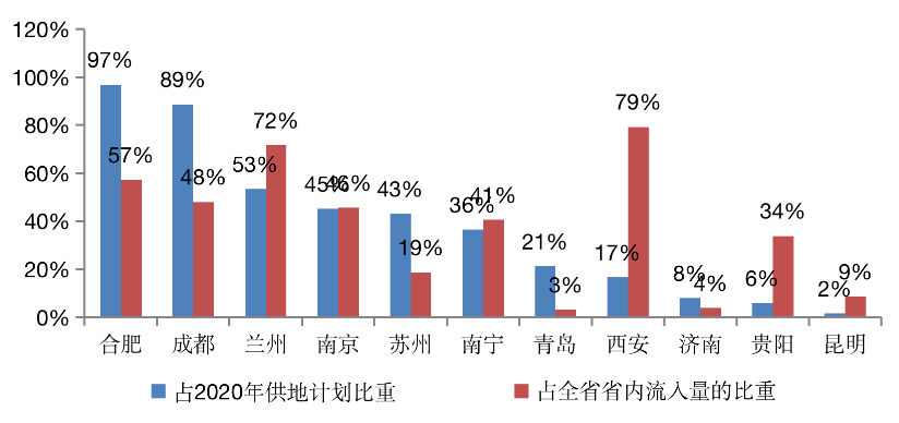 為了直觀對比典型城市用地指標(biāo)流轉(zhuǎn)對城市建設(shè)用地供應(yīng)的貢獻,我們將這些城市2016年以來的指標(biāo)累計調(diào)入量與2020年全年建設(shè)用地計劃供應(yīng)量進行對比,可見這些城市大多已處于高位。典型如合肥,2016年以來,省內(nèi)指標(biāo)流轉(zhuǎn)至合肥市本級的量高達(dá)1973公頃,這一體量達(dá)到2020合肥市本級計劃供應(yīng)2037公頃的97%。