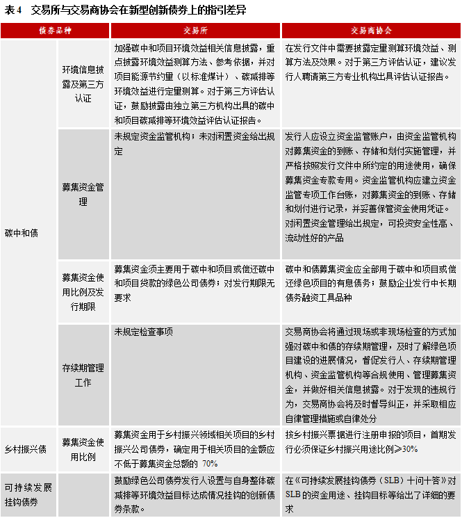 今年,交易商協(xié)會(huì)接連推出碳中和債、鄉(xiāng)村振興債、可持續(xù)發(fā)展掛鉤債券,進(jìn)一步提升了金融服務(wù)綠色發(fā)展和鄉(xiāng)村振興的戰(zhàn)略能力,在交易所修訂2021年版發(fā)行指引后,二者在創(chuàng)新債券項(xiàng)目上實(shí)現(xiàn)了一致。但是在募集資金管理、資金使用比例和存續(xù)期管理上有部分差異。