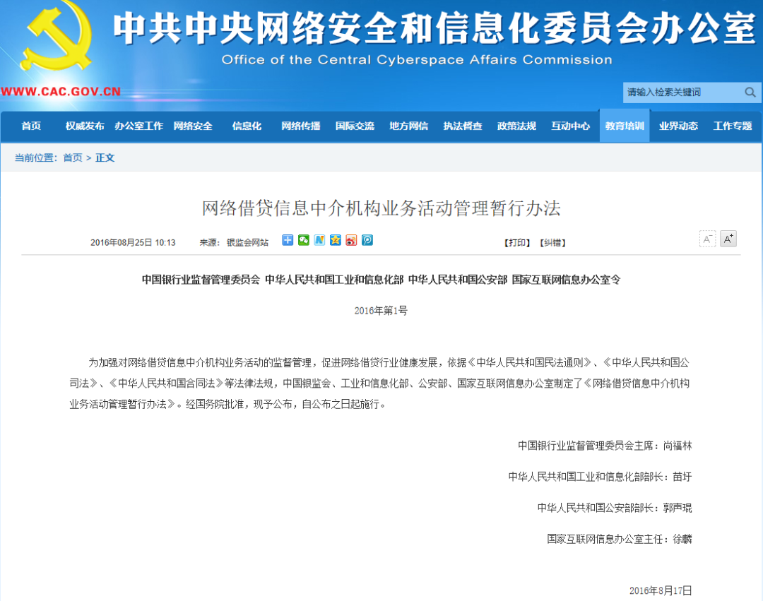 網(wǎng)絡(luò)借貸信息中介機(jī)構(gòu)業(yè)務(wù)活動(dòng)管理暫行辦法2016年8月17日發(fā)布