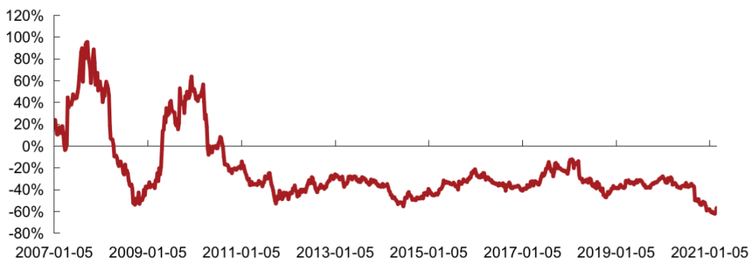 2021年2月克而瑞內(nèi)房股領(lǐng)先指數(shù)估值平穩(wěn),大盤走勢(shì)上行,指數(shù)相對(duì)恒指PE繼續(xù)走低。2021年2月相對(duì)恒指成分股的PE周均值為-60.4%,低于上月相對(duì)PE周均值-60.0%,低于2020年全年相對(duì)PE周均值-40.2%。