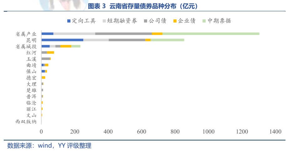 存量視角下,云南的債務集中在省屬國企與昆明區域,上層集中,尾部少量;品種方面以債務融資工具為主,需密切關注協會政策變動;期限結構也不理想,82%債券剩余到期/行權期限在兩年以內,短期內將面臨很沉重的剛性兌付壓力。