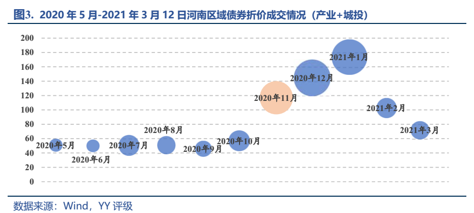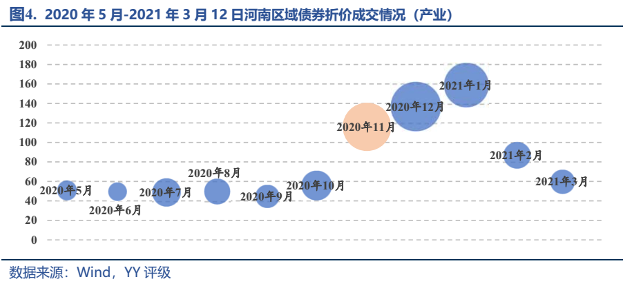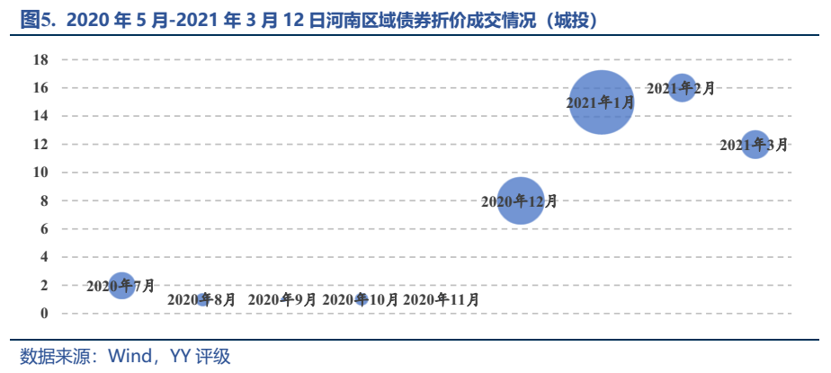 注:①縱軸為成交筆數(shù),若單日內(nèi)某只債券在多個市場多次成交,僅記為一筆成交,即單只債券日成交筆數(shù)不超過1筆;②氣泡大小為成交額;③折價成交以收益率高于8%來計算。