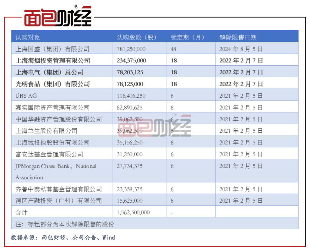 本次上市流通的限售股為上海海煙投資管理有限公司、上海電氣(集團)總公司、光明食品(集團)有限公司所持有的限售期限18個月的限售股。截至2021年上半年末,上述三大股東分別持有公司6.35億股,2.63億股和4.52億股,占公司總股本的比例分別為4.86%、2.01%和3.46%,均為公司前十大股東。