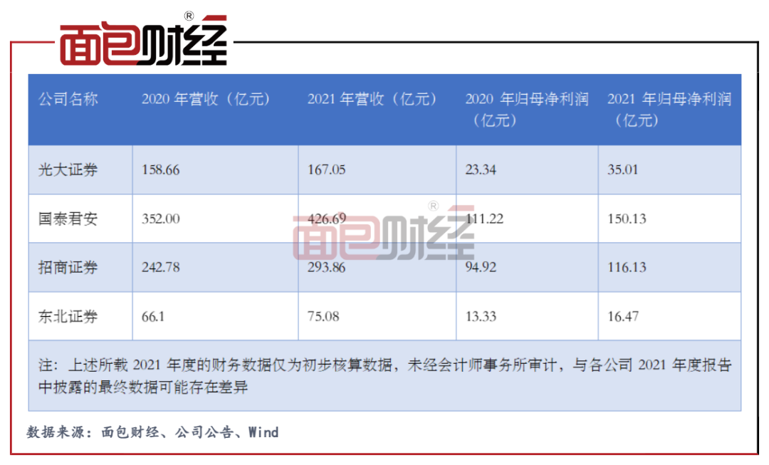 2022年1月21日至24日期間,光大證券、國泰君安、招商證券和東北證券四家券商發出2021年業績快報或預告,上述四家券商的2021年業績均預計同比較大幅度增加。(HXY)