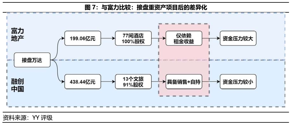 富力耗資199.06億元接盤了萬達(dá)77間酒店,融創(chuàng)則花費(fèi)438.44億元接盤了13個(gè)文旅項(xiàng)目,他們自此有了不一樣的未來。自該收并購方案來看,富力看似狠賺老王一百多個(gè)小目標(biāo)(最初酒店收并購方案的對價(jià)為300多億元)的接盤局下,最后卻沒能從重資產(chǎn)資金沉淀的泥淖走出,其中的癥結(jié)點(diǎn)仍在于重資產(chǎn)項(xiàng)目的配套住宅,即項(xiàng)目的可售/可變現(xiàn)程度。