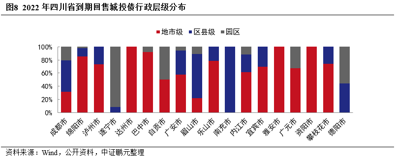 地市級平臺到期回售情況以成都、綿陽、瀘州為主,成都的區縣級平臺到期回售規模較為突出,園區級平臺到期回售主要分布在成都、遂寧、自貢