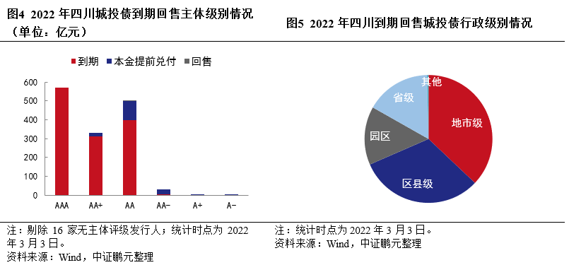 一、2022年四川省城投債到期回售規模全國排名靠前,可能發生回售的債券規模較大,3月為償債高峰期,AAA和AA級別規模占比較高,償債主體主要為地市級及區縣平臺,中期票據規模最大