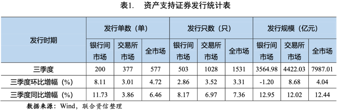 分市場(chǎng)看,2021年三季度,銀行間市場(chǎng)共發(fā)行200單503只資產(chǎn)支持證券,發(fā)行規(guī)模為3564.98億元,發(fā)行單數(shù)和只數(shù)環(huán)比、同比均有所增長(zhǎng),發(fā)行規(guī)模環(huán)比略有下降,同比有所增長(zhǎng);交易所市場(chǎng)共發(fā)行377單1028只資產(chǎn)支持證券,發(fā)行規(guī)模為4422.03億元,發(fā)行單數(shù)、只數(shù)和規(guī)模環(huán)比、同比均有所增長(zhǎng)(見(jiàn)表1)。總體看,交易所市場(chǎng)資產(chǎn)支持證券的發(fā)行規(guī)模環(huán)比增幅高于銀行間市場(chǎng),主要是交易所市場(chǎng)消費(fèi)性貸款、小額貸款和商業(yè)房地產(chǎn)抵押貸款等資產(chǎn)支持證券發(fā)行量上升所致。