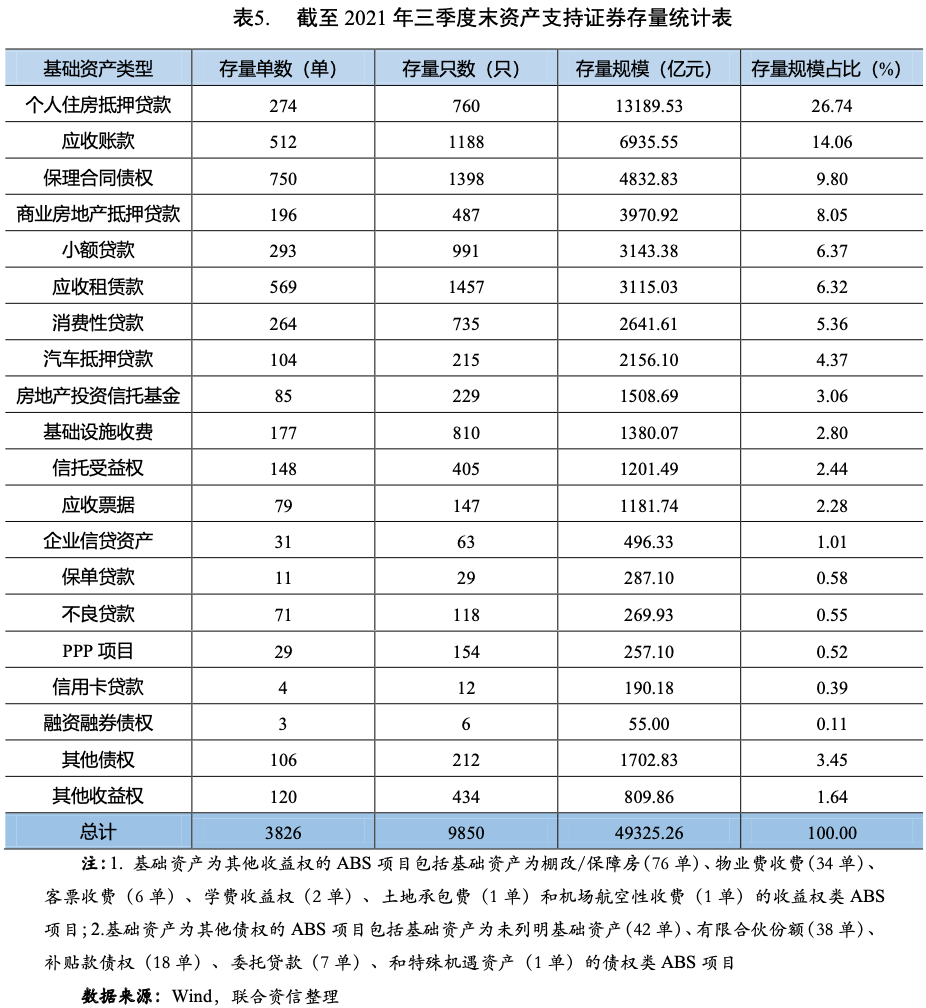 截至2021年三季度末,債券市場(chǎng)上共有3826單9850只資產(chǎn)支持證券存續(xù),本金存量規(guī)模為49325.26億元。從存量規(guī)模占比來(lái)看(見(jiàn)表5),前五大基礎(chǔ)資產(chǎn)類型分別為個(gè)人住房抵押貸款(26.74%)、應(yīng)收賬款(14.06%)、保理合同債權(quán)(9.80%)、商業(yè)房地產(chǎn)抵押貸款(8.05%)和小額貸款(6.37%)。