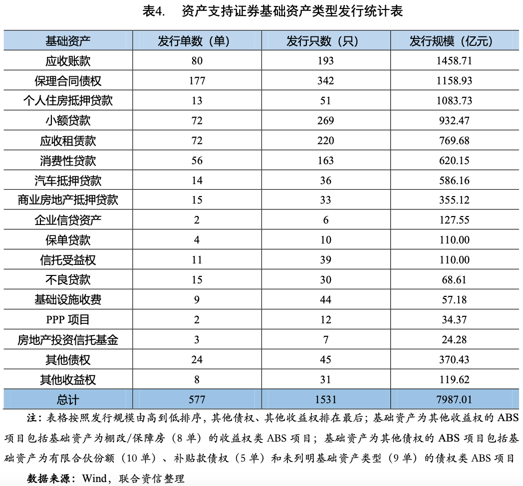 按照基礎(chǔ)資產(chǎn)類型統(tǒng)計(jì),2021年三季度,應(yīng)收賬款(1458.71億元)、保理合同債權(quán)(1158.93億元)和個(gè)人住房抵押貸款(1083.73億元)均超過(guò)1000億元,是發(fā)行規(guī)模最大的三類基礎(chǔ)資產(chǎn),其次是小額貸款(932.47億元)、應(yīng)收租賃款(769.68億元)和消費(fèi)性貸款(620.15億元),發(fā)行規(guī)模均超過(guò)600億元;從發(fā)行單數(shù)看,保理合同債權(quán)(177單)、應(yīng)收賬款(80單)、應(yīng)收租賃款(72單)、小額貸款(72單)和消費(fèi)性貸款(56單)排名前五位(見(jiàn)表4)。