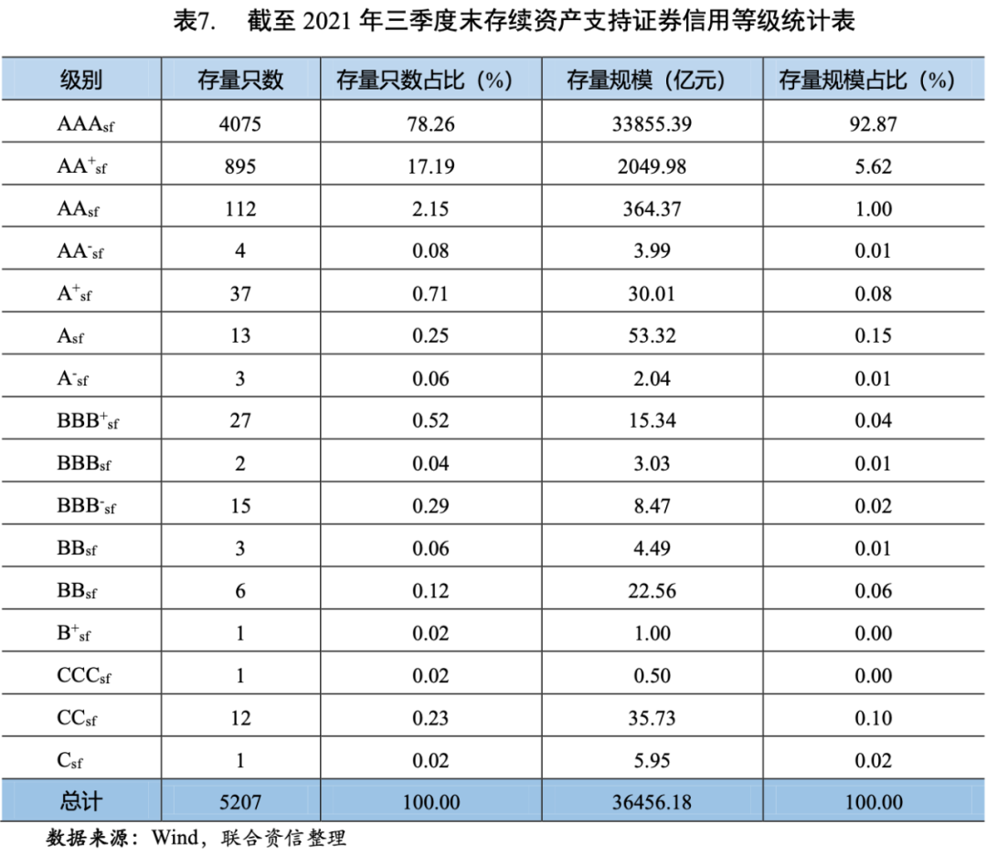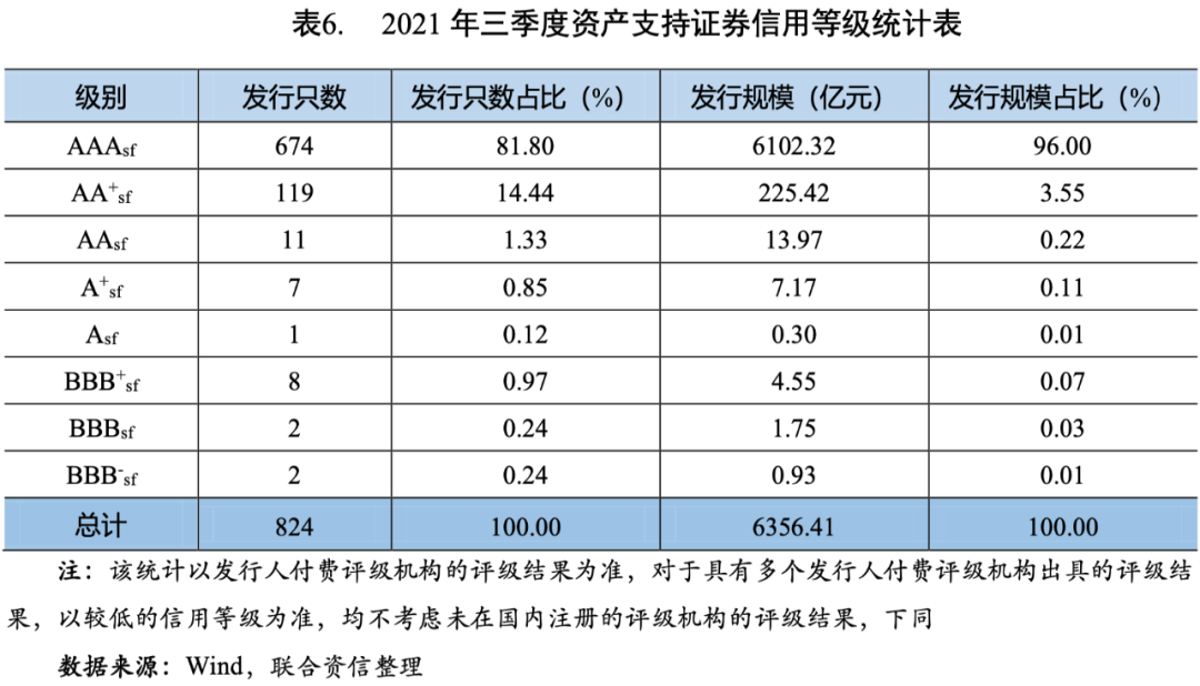 2021年三季度,新發(fā)行的資產(chǎn)支持證券中,有824只具有信用評(píng)級(jí),總體上集中于AAAsf和AA+sf,AAAsf級(jí)資產(chǎn)支持證券的發(fā)行只數(shù)占比81.80%,發(fā)行規(guī)模占比96.00%;AA+sf級(jí)資產(chǎn)支持證券的發(fā)行只數(shù)占比約14.44%,發(fā)行規(guī)模占比約3.55%(見(jiàn)表6)。