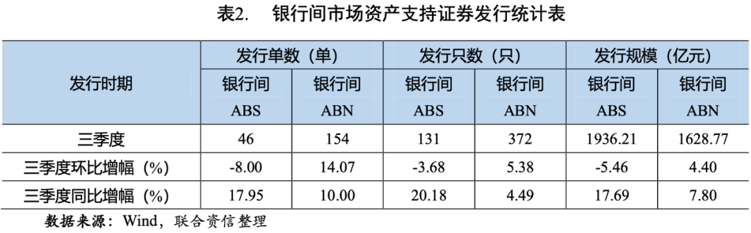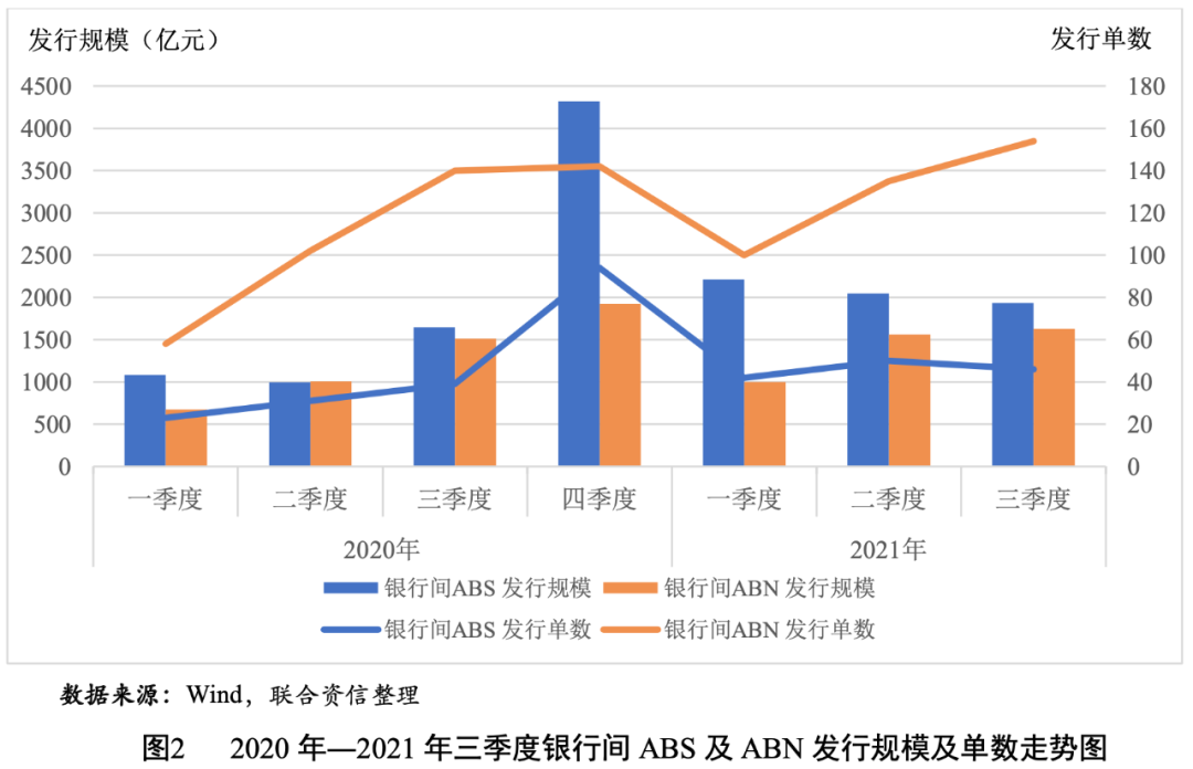 從銀行間市場(chǎng)來(lái)看,2021年三季度,信貸資產(chǎn)支持證券(以下簡(jiǎn)稱“銀行間ABS”)共發(fā)行46單131只,發(fā)行規(guī)模為1936.21億元,發(fā)行單數(shù)、只數(shù)和發(fā)行規(guī)模環(huán)比均有所下降,與上年同期相比,發(fā)行單數(shù)、只數(shù)、發(fā)行規(guī)模均大幅上升;銀行間資產(chǎn)支持票據(jù)(以下簡(jiǎn)稱“銀行間ABN”)共發(fā)行154單372只,發(fā)行規(guī)模為1628.77億元,發(fā)行單數(shù)、只數(shù)和規(guī)模環(huán)比、同比均有所增長(zhǎng)(見(jiàn)表2和圖2)。總體看,三季度銀行間ABS發(fā)行單數(shù)、只數(shù)和規(guī)模同比增幅較銀行間ABN更高,主要源于基礎(chǔ)資產(chǎn)為小額貸款的資產(chǎn)支持證券發(fā)行同比增幅較大,在引導(dǎo)金融機(jī)構(gòu)加大對(duì)小微企業(yè)支持力度的政策背景下,發(fā)行小微企業(yè)貸款A(yù)BS是銀行用來(lái)盤(pán)活存量小微貸款、打通小微企業(yè)融資渠道、助力普惠金融發(fā)展的一項(xiàng)重要舉措。