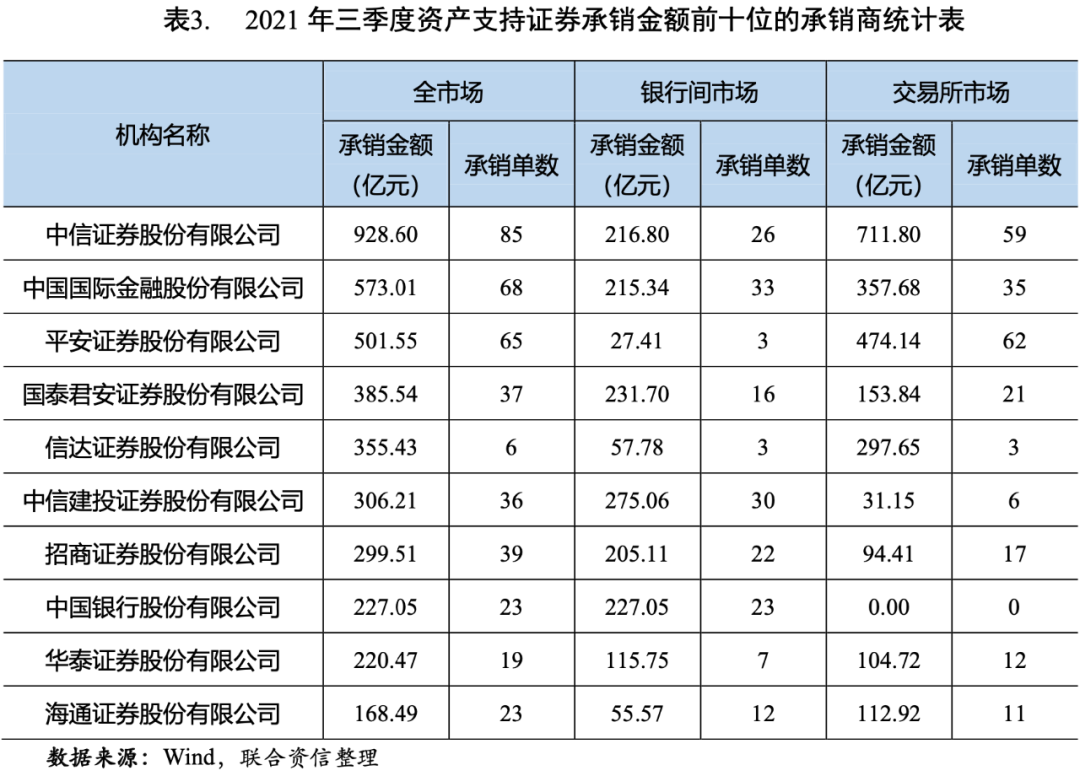 從資產(chǎn)支持證券的承銷情況來(lái)看,2021年三季度,中信證券股份有限公司、中國(guó)國(guó)際金融股份有限公司和平安證券股份有限公司的承銷金額、承銷單數(shù)均位居前三位(見(jiàn)表3)。