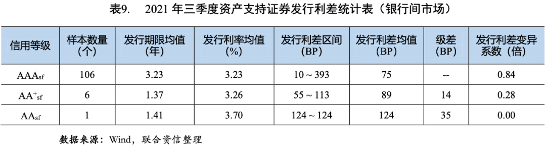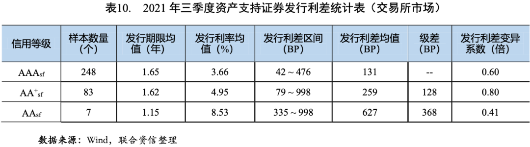 2021年三季度資產(chǎn)支持證券市場(chǎng)規(guī)模穩(wěn)步增長(zhǎng),共發(fā)行577單1531只資產(chǎn)支持證券,發(fā)行規(guī)模7987.01億元,環(huán)比和同比均有所上升,其中交易所市場(chǎng)資產(chǎn)支持證券的發(fā)行規(guī)模環(huán)比增幅高于銀行間市場(chǎng),銀行間ABS發(fā)行單數(shù)、只數(shù)和規(guī)模同比增幅較銀行間ABN更高。資產(chǎn)支持證券發(fā)行信用等級(jí)主要集中于AAAsf和AA+sf,AAAsf、AA+sf和AAsf級(jí)資產(chǎn)支持證券的發(fā)行利差均值分別為113BP、247BP和564BP,各信用等級(jí)利差檢驗(yàn)均具有顯著差異,信用評(píng)級(jí)對(duì)資產(chǎn)支持證券的信用風(fēng)險(xiǎn)具有良好的區(qū)分度。