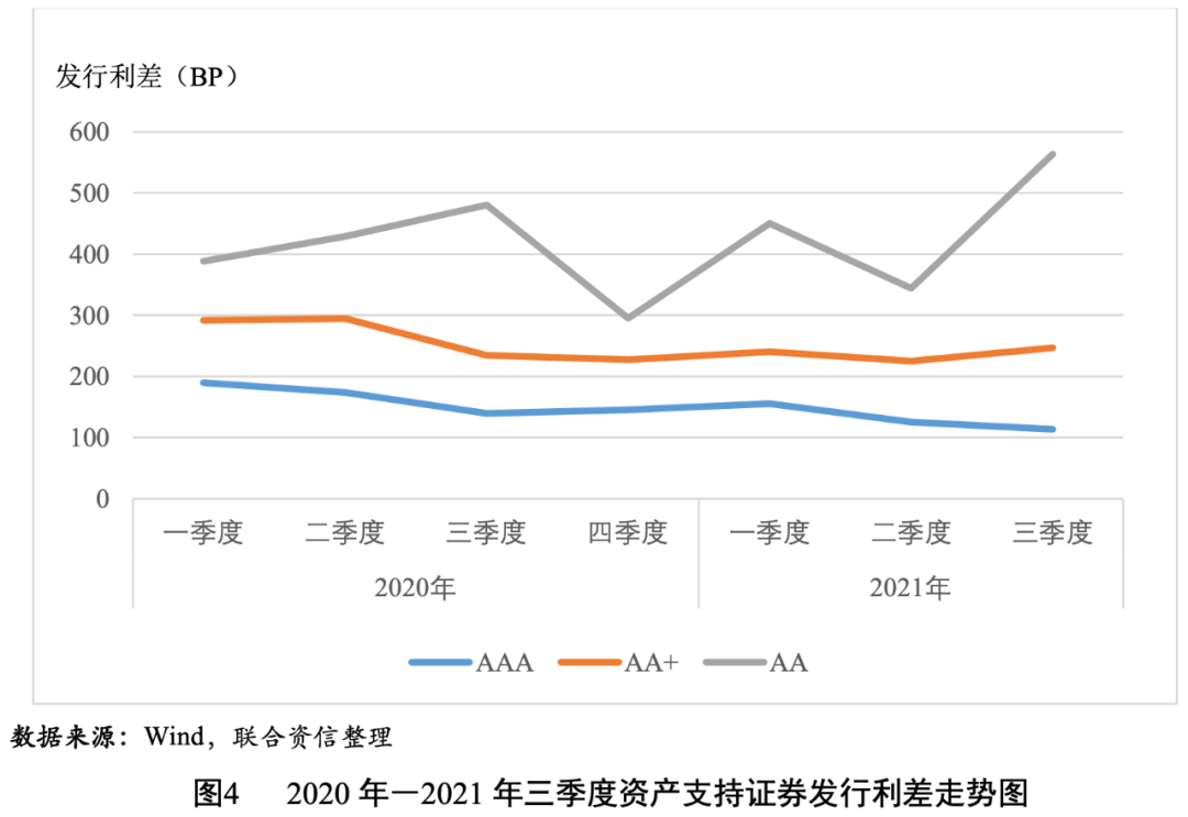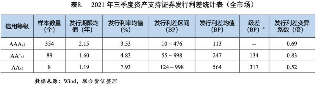 2021年三季度,資產(chǎn)支持證券的發(fā)行利率和利差均值均隨信用等級(jí)的下降而上升(見(jiàn)圖3和圖4),說(shuō)明信用評(píng)級(jí)對(duì)資產(chǎn)支持證券的信用風(fēng)險(xiǎn)具有較好的區(qū)分度。AAAsf、AA+sf和AAsf級(jí)資產(chǎn)支持證券的發(fā)行利差均值分別為113BP、247BP和564BP,AAAsf級(jí)資產(chǎn)支持證券的發(fā)行利差均值環(huán)比下降12BP,同比下降26BP;AA+sf和AAsf級(jí)資產(chǎn)支持證券的發(fā)行利差均值環(huán)比分別上升22BP和220BP,同比分別上升13BP和84BP。AAAsf級(jí)和AA+sf級(jí)之間的級(jí)差為134BP,同比、環(huán)比均有所上升,反映了在經(jīng)濟(jì)恢復(fù)趨緩背景下,市場(chǎng)不確定性上升,投資者對(duì)低級(jí)別資產(chǎn)支持證券要求的風(fēng)險(xiǎn)溢價(jià)進(jìn)一步提高;AA+sf級(jí)和AAsf級(jí)之間的級(jí)差為317BP,可能與AAsf級(jí)資產(chǎn)支持證券樣本數(shù)目過(guò)少而缺乏代表性有關(guān)。AA+sf級(jí)資產(chǎn)支持證券的發(fā)行利差的變異系數(shù)相對(duì)較高,說(shuō)明投資者對(duì)AA+sf級(jí)資產(chǎn)支持證券的信用風(fēng)險(xiǎn)判斷存在分化。