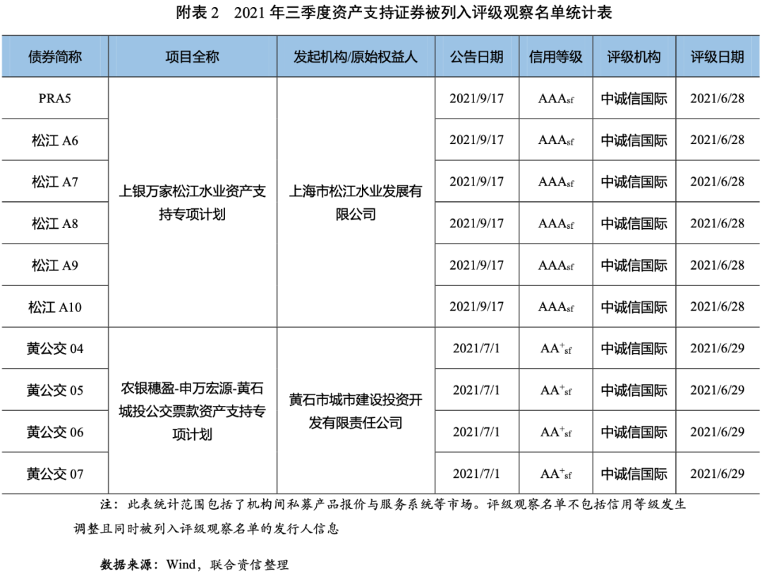 2021年三季度,債券市場(chǎng)上未出現(xiàn)資產(chǎn)支持證券違約;14只資產(chǎn)支持證券信用評(píng)級(jí)下調(diào)(見(jiàn)附表1),同比大幅增加7只;10只資產(chǎn)支持證券被列入評(píng)級(jí)觀察名單[2](見(jiàn)附表2),同比減少4只。