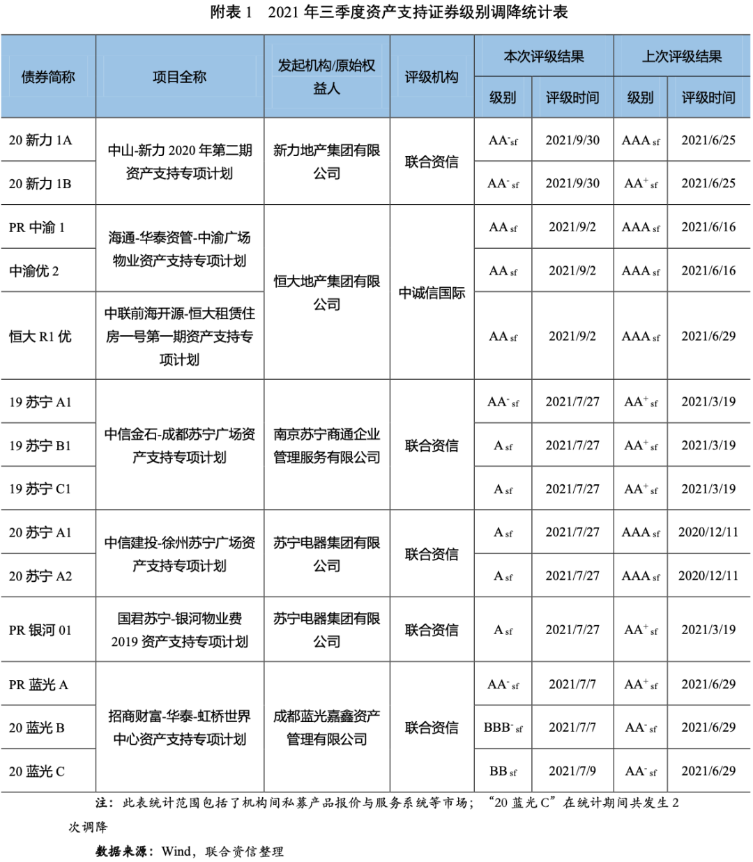 級(jí)別下調(diào)方面,市場(chǎng)共有5家原始權(quán)益人發(fā)起的7單14只資產(chǎn)支持證券債項(xiàng)評(píng)級(jí)發(fā)生下調(diào),原始權(quán)益人家數(shù)同比增加2家,發(fā)行單數(shù)同比增加4單,只數(shù)同比增加7只。本季度資產(chǎn)支持證券發(fā)生評(píng)級(jí)下調(diào)的級(jí)別變動(dòng)較大,其中8只債券下調(diào)3個(gè)級(jí)別及以上。本季度級(jí)別下調(diào)資產(chǎn)支持證券涉及的行業(yè)為房地產(chǎn)。從級(jí)別下調(diào)原因來(lái)看,本季度資產(chǎn)支持證券級(jí)別下調(diào)主要原因是2021年以來(lái)國(guó)家加大對(duì)房地產(chǎn)行業(yè)的調(diào)控,在“三道紅線”、“兩個(gè)集中”等政策壓力下,房地產(chǎn)企業(yè)銷售增速下滑,投資增速回落,短期償債壓力加大,在此背景下,負(fù)債率較高、擴(kuò)張較為激進(jìn)的恒大地產(chǎn)集團(tuán)有限公司(海通-華泰資管-中渝廣場(chǎng)物業(yè)資產(chǎn)支持專項(xiàng)計(jì)劃和中聯(lián)前海開(kāi)源-恒大租賃住房一號(hào)第一期資產(chǎn)支持專項(xiàng)計(jì)劃的差額支付承諾人)、新力地產(chǎn)集團(tuán)有限公司(中山-新力2020年第二期資產(chǎn)支持專項(xiàng)計(jì)劃的差額支付承諾人)和四川藍(lán)光發(fā)展股份有限公司(招商財(cái)富-華泰-虹橋世界中心資產(chǎn)支持專項(xiàng)計(jì)劃的差額支付承諾人)深陷債務(wù)危機(jī),造成相關(guān)債券級(jí)別的大幅下調(diào)。此外,受蘇寧電器集團(tuán)有限公司主體級(jí)別發(fā)生下調(diào)影響,其作為差額支付承諾人的中信建投-徐州蘇寧廣場(chǎng)資產(chǎn)支持專項(xiàng)計(jì)劃和國(guó)君蘇寧-銀河物業(yè)費(fèi)2019資產(chǎn)支持專項(xiàng)計(jì)劃以及其作為擔(dān)保人的中信金石-成都蘇寧廣場(chǎng)資產(chǎn)支持專項(xiàng)計(jì)劃的相關(guān)債券級(jí)別均出現(xiàn)大幅下調(diào)。