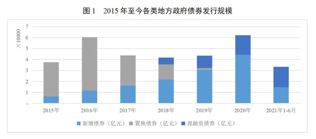 按照前期化解地方政府存量債務的安排,2015至2017年發行的地方債中以置換債券為主,2018年新增債發行規模超過置換債券和再融資債券規模;2019年至2020年,地方政府債中主要是新增債券;2021年上半年,再融資債券發行規模較大。