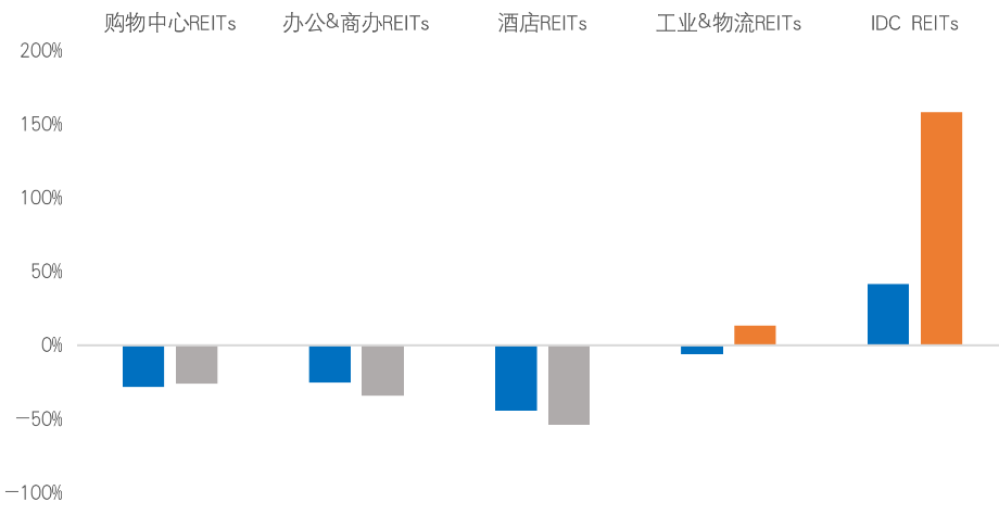 在新加坡市場上市的吉寶IDC REITs作為唯一以數(shù)據(jù)中心為底層資產(chǎn)的REITs今年表現(xiàn)搶眼,頗受市場投資者追捧,較年初已實現(xiàn)超40%漲幅,REITs溢價目前已超150%。而折溢價本身正體現(xiàn)著REITs對于不動產(chǎn)市場的價格發(fā)現(xiàn)功能,除IDC REITs外,恢復(fù)情況較好的工業(yè)/物流REITs也實現(xiàn)了折溢價的“由負(fù)轉(zhuǎn)正”。