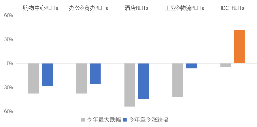 3月黑天鵝事件下,隨著美股的多次震蕩,新加坡&香港市場REITs行情在3月23日來到今年最低點,其中酒店類REITs跌幅最大,跌幅超5成,以數(shù)據(jù)中心為底層資產(chǎn)的IDC REITs跌幅最小僅有4.8%。