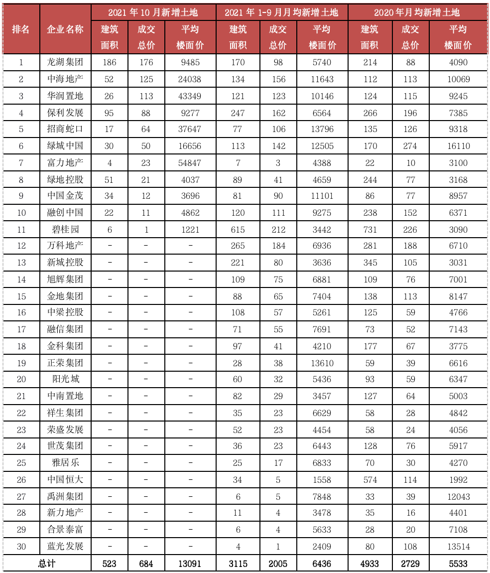 表:2021年10月30家監(jiān)測(cè)企業(yè)新增土地統(tǒng)計(jì)表(單位:萬平方米、億元、元/平方米)