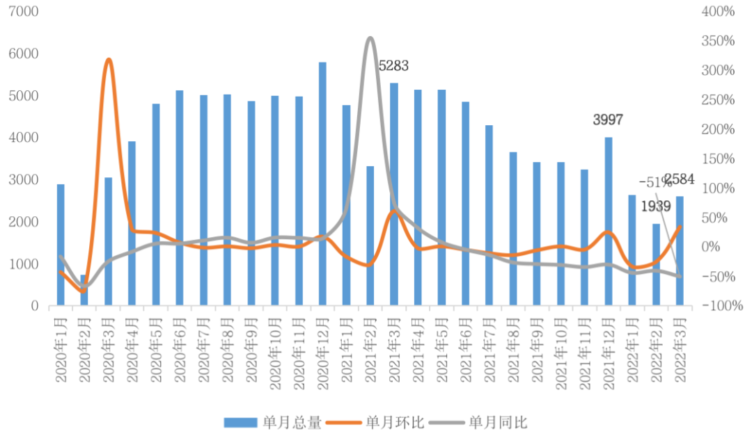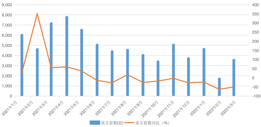從月度數(shù)據(jù)來看,2022年1月共成交4614套,2月成交1698套,3月僅成交3541套,其中2月成交套數(shù)同比下降超六成。
