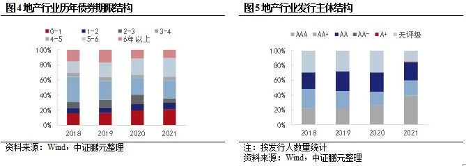 從新增債券特征看,地產(chǎn)行業(yè)債券期限短期化趨勢(shì)明顯,3年期以下品種占比從2018年31%升至2020年的41%。發(fā)行主體結(jié)構(gòu)在2020年之前波動(dòng)不大,但2021年來高等級(jí)主體占比明顯提升,無評(píng)級(jí)主體占比下降,這與“三道紅線”[2]的新政有關(guān)系。
