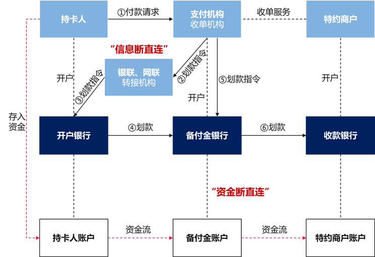 資金斷直連:自2017年4月17日起, 支付機構應將客戶備付金按照一定比例交存至指定機構專用存款賬戶, 首次交存的平均比例為20%左右, 最終將實現全部客戶備付金集中存管。 |