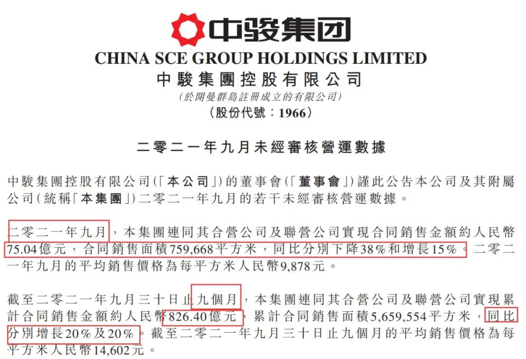 正好前不久,中駿集團(tuán)發(fā)布了9月銷售情況。公告顯示,2021年9月,其連同合營、聯(lián)營公司的合同銷售金額約75.04億元,合同銷售面積759,668平米,同比確實(shí)降了,降幅還不小,分別為38%和增長15%。