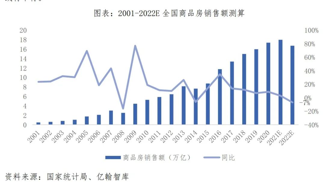 2001年以來,房地產(chǎn)開發(fā)投資同比增速從未出現(xiàn)過負(fù)增長,最差的一年出現(xiàn)在2015年,同比增速為0.9%。但是在隨著新開工預(yù)期的下降,商品房市場(chǎng)成交量預(yù)期看衰,開發(fā)投資或?qū)⒃?022年首次出現(xiàn)負(fù)增長。