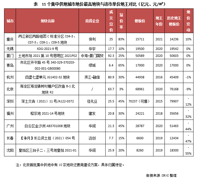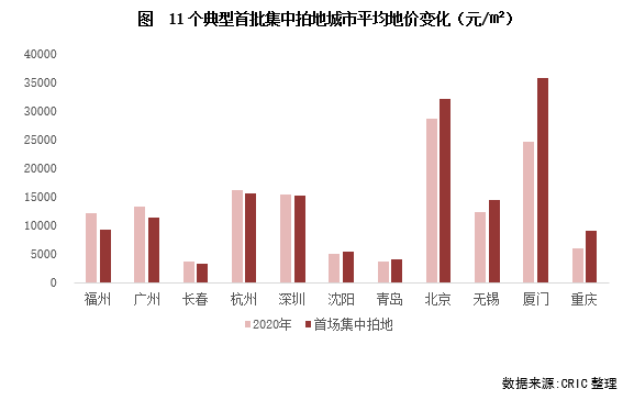 從11個已經完成首批集中土拍城市的地價水平來看,和2020年全年涉宅地價格相比,11城中福州、廣州、長春、杭州和深圳成交地價不及去年水平,其余城市地價上漲均十分突出,尤其是重慶,增幅最大,高達50%,廈門在島內兩宗優質地塊的助力之下,地價也明顯上升,5宗地平均樓板價達35823元/平方米,超越了一線的北京和深圳。