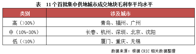 進一步對11個首批集中拍地城市測算毛利率,結果發現,本次土拍市場表現比較平穩的青島、福州、廣州等城市的毛利率均在30%以上,處于相對較高水平;而土拍情緒高漲、地價明顯上漲的無錫、重慶、廈門等城市的毛利率處于較低水平,多處于10%,封頂+高配建之下,無錫多宗地塊大概率面臨虧損。