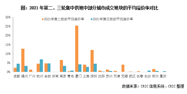 相較于招拍掛,收并購獲得的二手項目歷史遺留問題復雜,面臨諸多風險,對房企整體的投資眼光、盡調和資產評估能力提出較高要求。通常上,收并購作為招拍掛拿地的替代方式,當土拍競爭激烈時,收并購現象可能頻繁。而2021年第二、三輪集中供地溢價率大幅下滑,單項目利潤率相對充足,優(yōu)質房企對收并購的意愿可能降低,更傾向于獲取土拍市場回報率容易評估的項目。